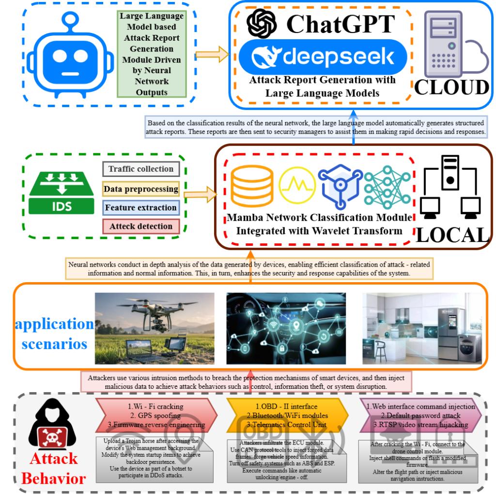 物联网的加速普及使智能化攻击检测成为保障其安全的关键环节。然而,物联网设备会持续产生海量且高度异构的数据,再加上攻击手段日趋隐蔽与复杂,使得从中提取具有判别力的特征并准确区分正常与恶意行为面临巨大挑战。为此,论文提出WaveMamba,一种将小波变换与Mamba架构深度融合的新型物联网攻击检测模型。小波变换具备卓越的时频局部化能力,可将原始序列分解为多尺度的近似与细节系数;同时,基于连续状态空间模型构建的Mamba模块擅长捕获序列数据中的长程依赖关系。WaveMamba在架构中将小波分析与Mamba的动态建模机制有机结合,实现了时频表达与多尺度序列建模的高效协同。实验结果表明,WaveMamba显著优于现有方法,为提升智能化攻击检测在人工智能时代的精度提供了新的可能。