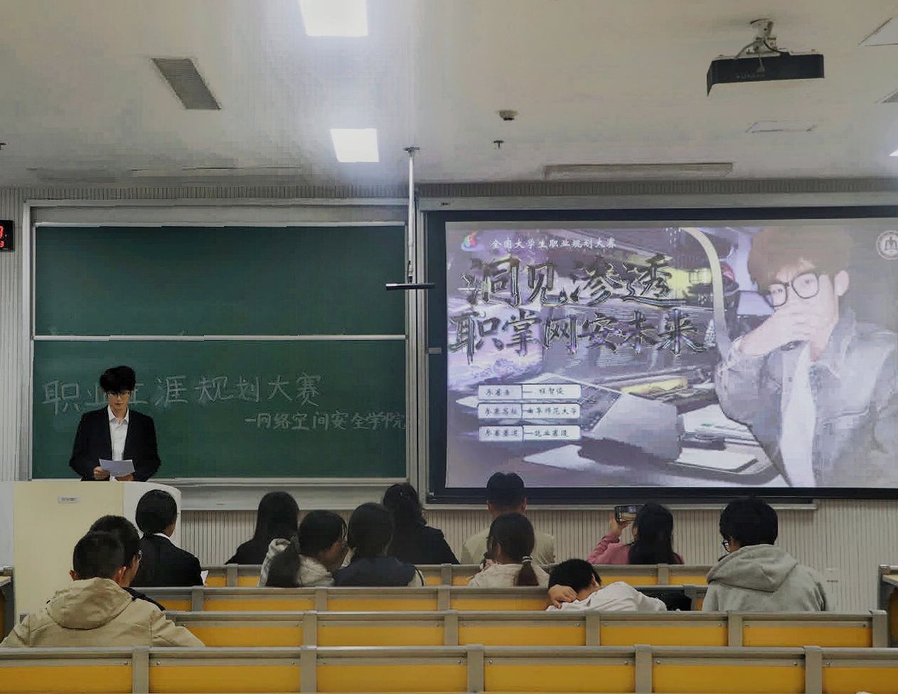 大学生职业规划大赛于格物楼B106教室成功举办。学院党委副书记范瑞红,辅导员洪亚玲、张晗,就业实践部部长张馨月担任评委,就业实践部副部长张妍主持比赛。