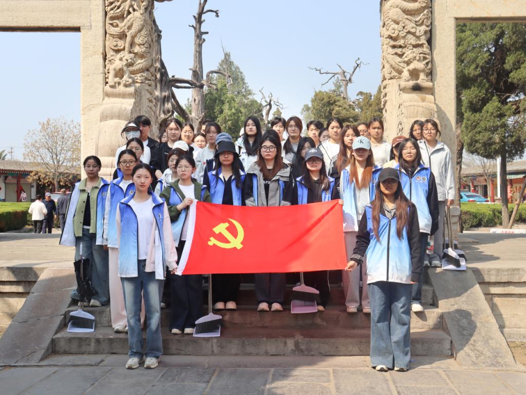 在孔林开展党建教育志愿服务活动。本次活动由学院“数智融创”辅导员工作室主办,林前社区党委副书记、居委会主任田保兵带队,学院50名青年学子代表参加。
