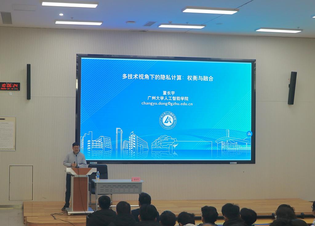 院讯(通讯员:曹腾 唐金梦 摄影:付瑜坤 程晨阳)2025年12月5日上午,应我院副院长马旭教授邀请,广州大学董长宇教授为我院作题为《多技术视角下的隐私计算:权衡与融合》的学术报告。本次报告在致知楼B202举行,由马旭副院长主持,教师代表、2024以及2025级全体研究生参加。