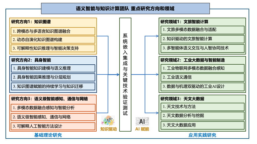 语义智能与知识计算团队面向国家重大战略需求,致力于知识图谱、人工智能、大数据、智能通信等新一代信息技术与产业应用的深度融合,以及计算、通信、控制等多学科交叉应用,重点部署知识图谱、具身智能、语义级智能感知、通信与网络等研究方向,聚焦文旅智能计算、工业大数据与智能制造、天文大数据等重点领域展开基础研究和应用实践研究。
